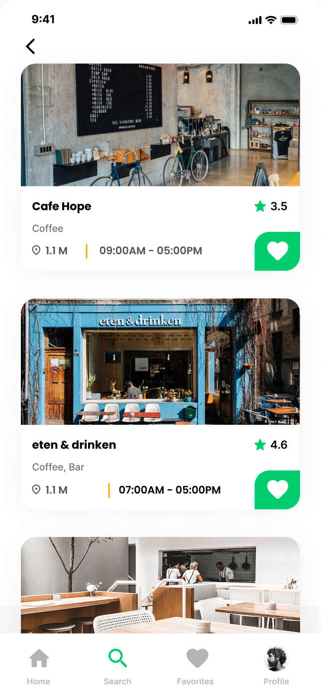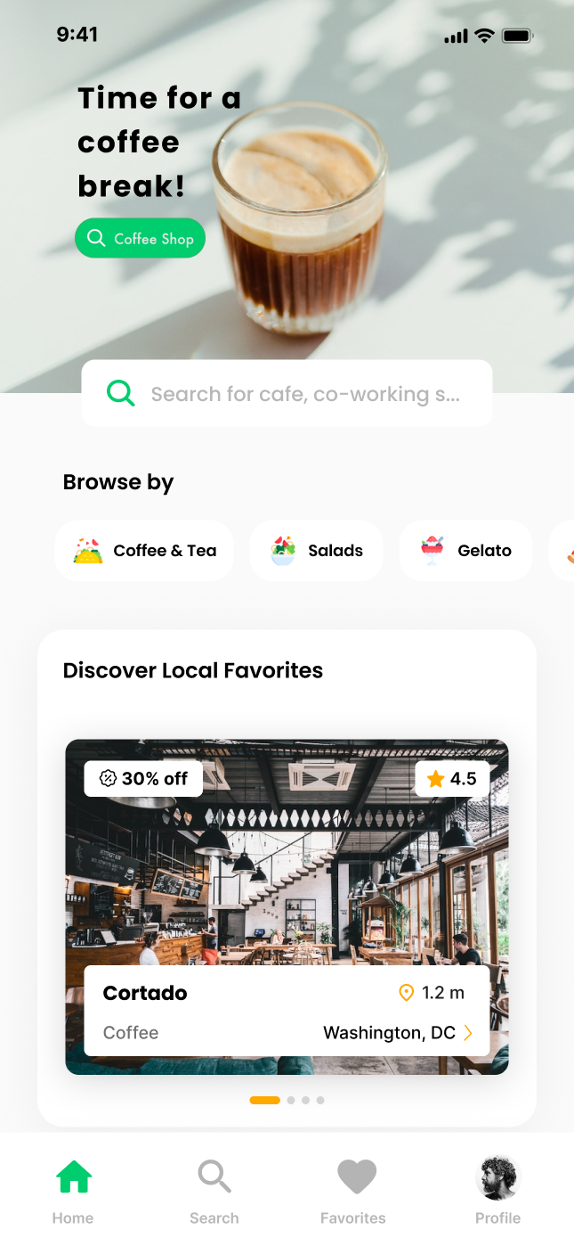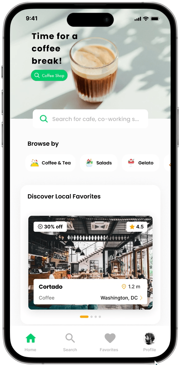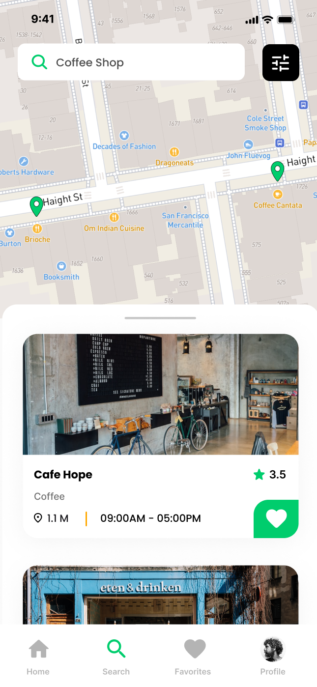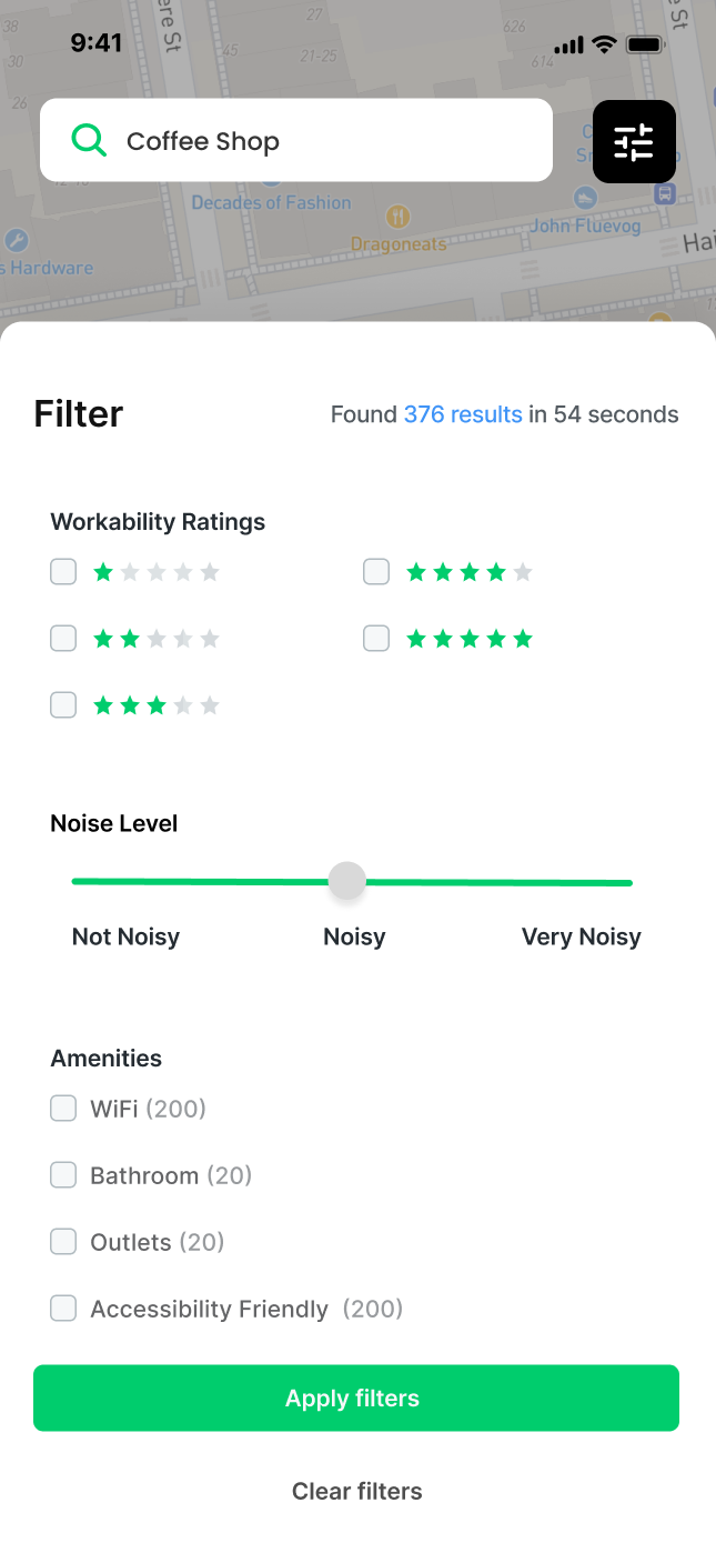 Optomized Filter Search: Filter search by noise level, bathroom access, and WiFi availability.