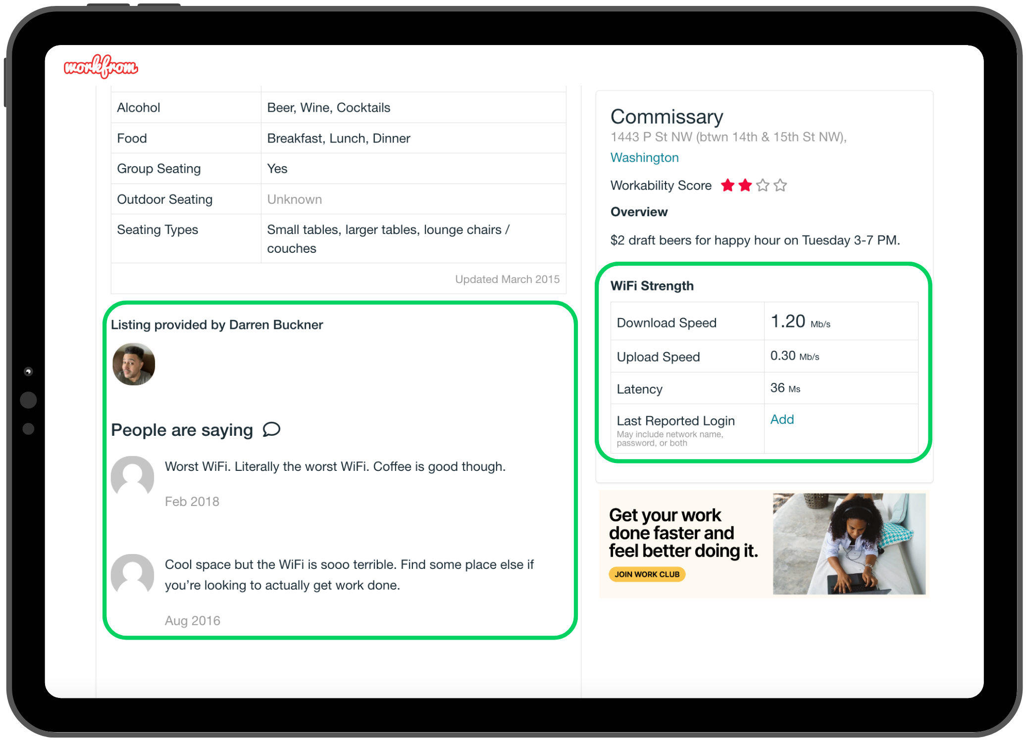 For my demo, I picked Yelp and Google Maps, the top apps for finding public places. I also found Work From, a website that helps users locate workspaces.