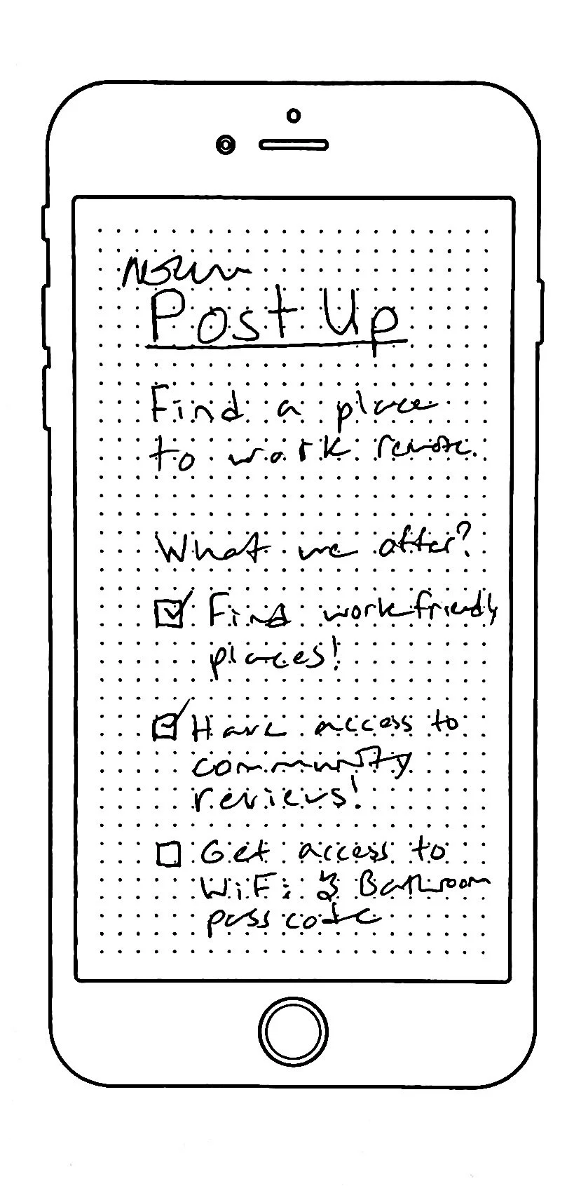 PostUp is a startup aiming to develop an iOS app that helps freelancers and remote workers find public spaces to work remotely.